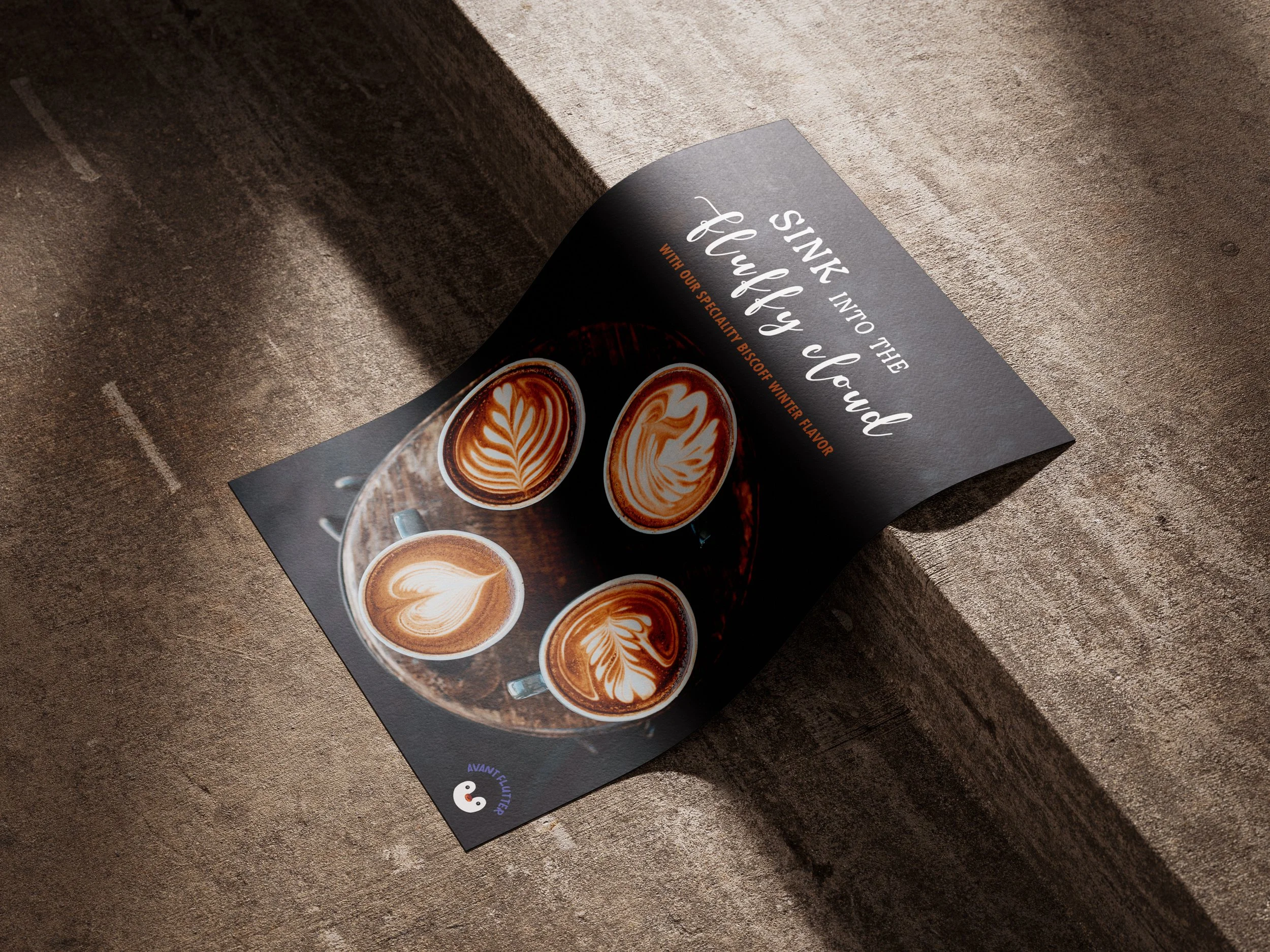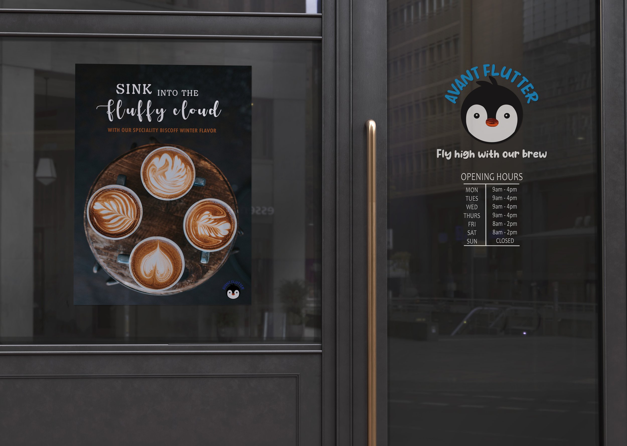 The goal for this coffee shop was to create a coffee brand that is not so obvious. The mascot of the coffee brand is a penguin, a flightless bird. Despite that, the penguin has wings and can flap and flutter. Avant (original) Flutters is a coffee brand that is offering its new flavor within its ad.