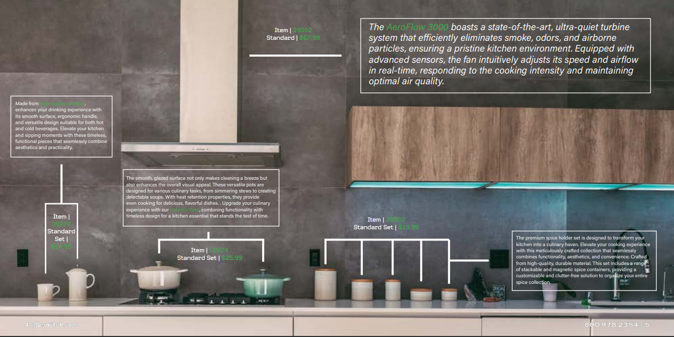In comparison to the first featured spread, this spread highlights a single specific product that Neokitch offers. New arrivals are crucial to the company as they help boost revenue through advancements and improvements from their previous models.